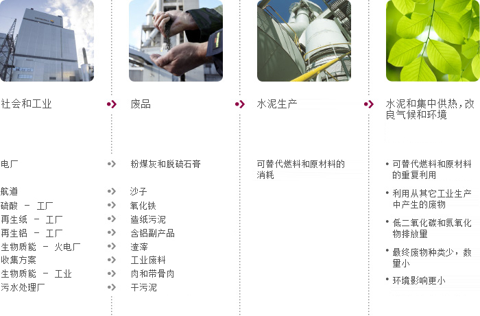 通過(guò)在水泥生產(chǎn)過(guò)程中回收和有效利用燃料和備選原材料,廢料和副產(chǎn)品得到了充分利用。所有成分得到了消耗而沒(méi)有新的副產(chǎn)品產(chǎn)生。