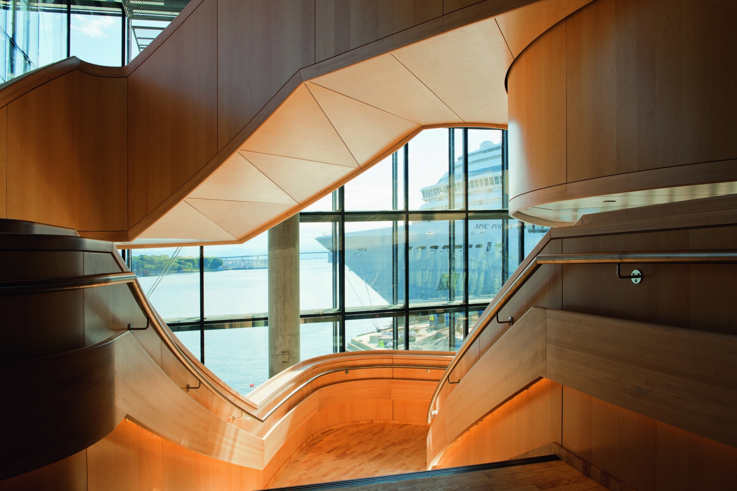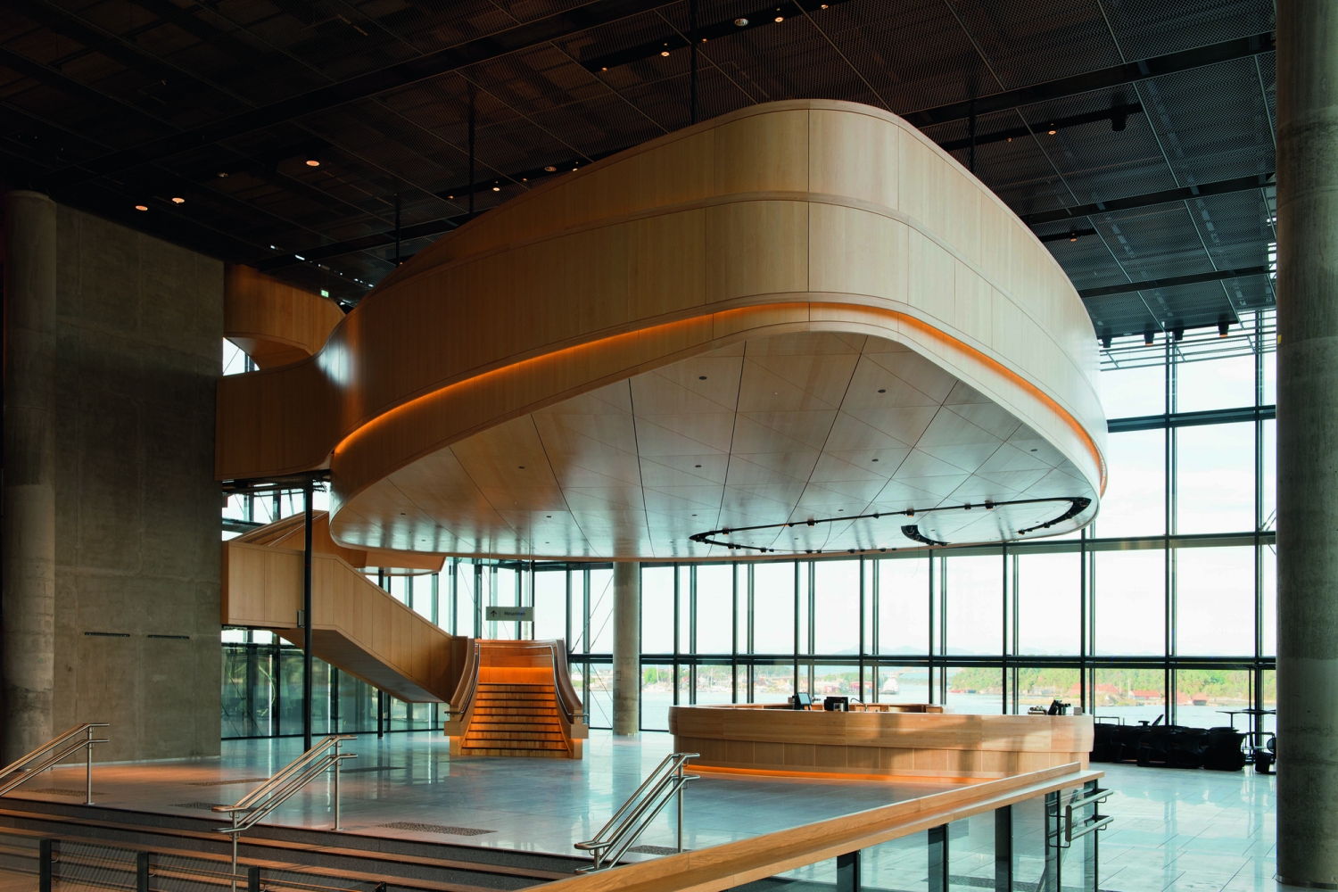 兩座禮堂并排而立:斯塔萬格的新音樂廳由Ratio建筑事務(wù)所設(shè)計(jì),容納一個管弦樂廳、一個多功能廳、一個餐廳、一個咖啡館和給幾個酒吧。音樂廳包含兩棟由玻璃和混凝土建成的建筑。玻璃結(jié)構(gòu)是敞開的,透明、穩(wěn)固且富有變化的。紅色的混凝土結(jié)構(gòu)是密封的,更加的精致堅(jiān)實(shí)。大樓的兩個部分分別為多功能廳和管弦樂廳,每個部分都為獨(dú)立的結(jié)構(gòu),且相互隔音。這樣可以同時(shí)在兩個演奏大廳內(nèi)進(jìn)行表演,而又不會影響各個廳內(nèi)的音響效果。
