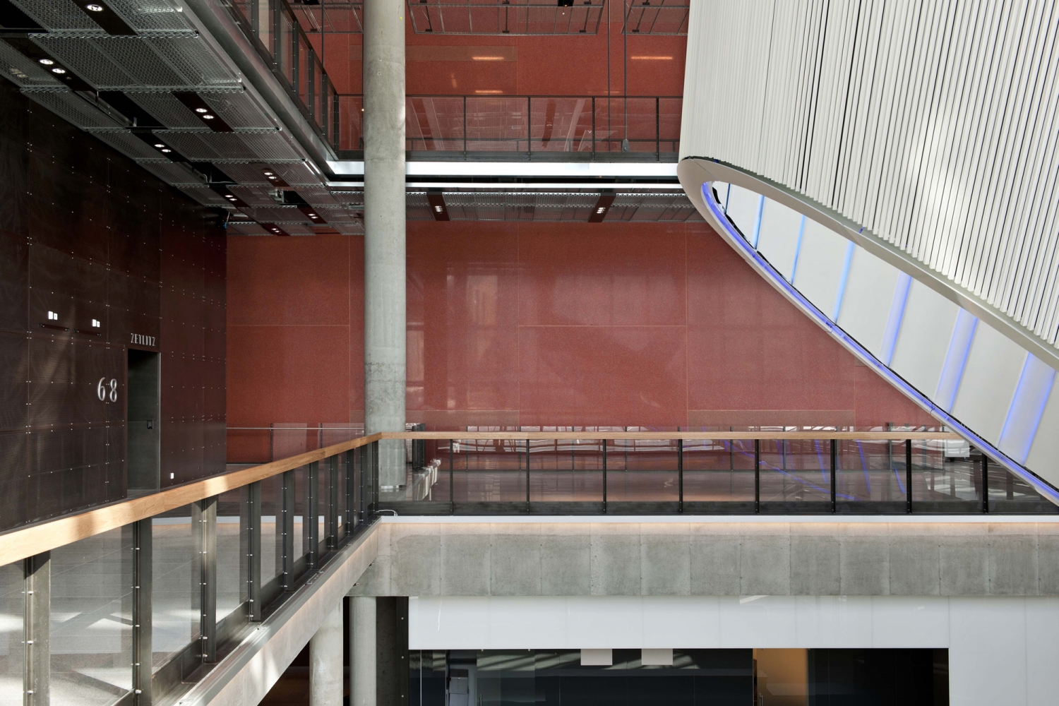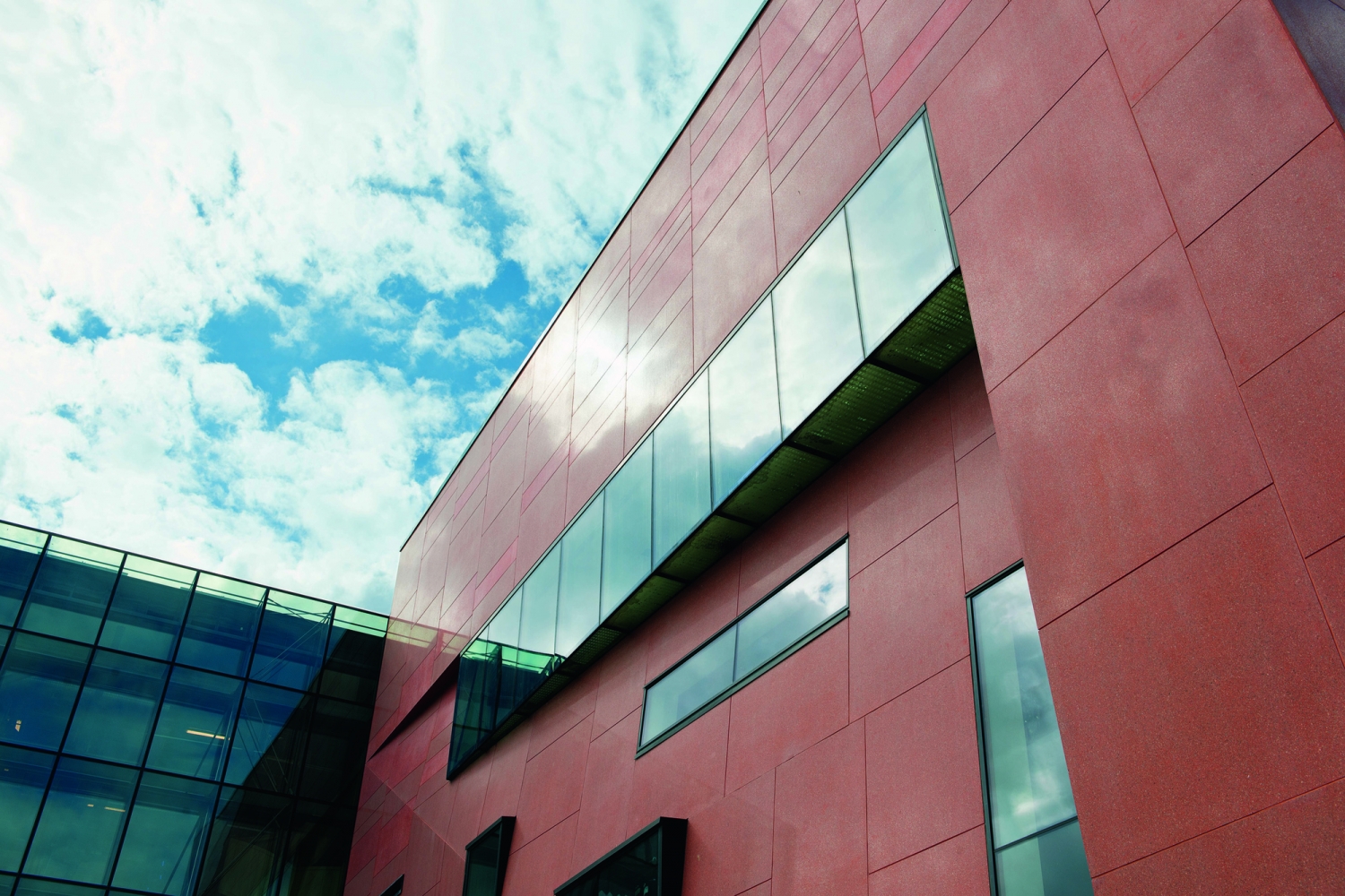 大樓的北部立面由仿花崗石質(zhì)地混凝土和仿玻璃質(zhì)地混凝土建成,面積大約為4 000平方米,由不同尺寸的375個混凝土預(yù)制構(gòu)件組成——經(jīng)過了砂紙打磨、拋光以及防水處理。構(gòu)件的重量從430公斤 – 20噸不等,使用30噸紅色玻璃和30噸透明玻璃制造。這些構(gòu)件由AS Betong生產(chǎn)和安裝,水泥則是阿爾博波特蘭生產(chǎn)的阿爾博?水泥。